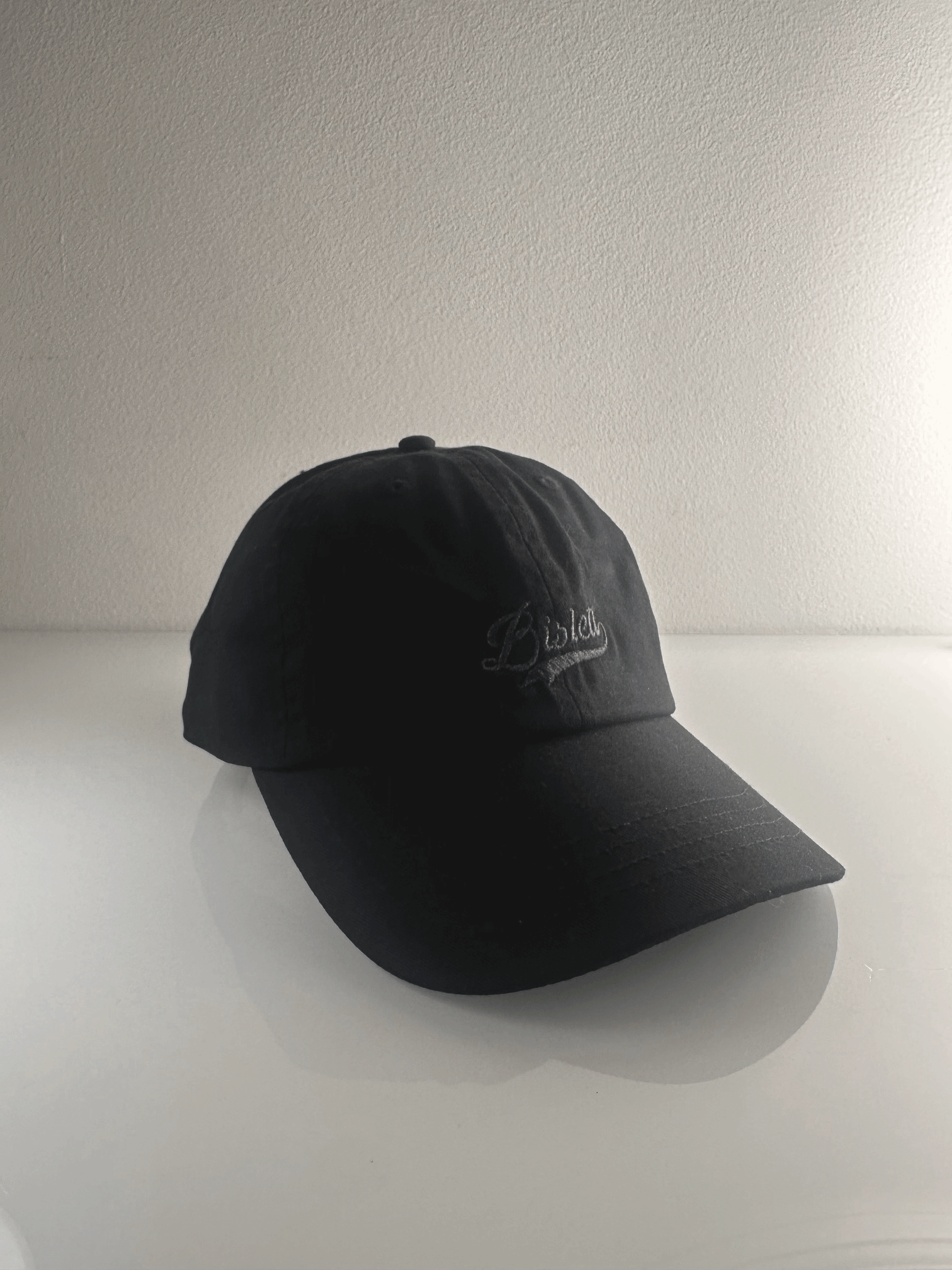 Caps i fargen svart med Bislett brodert med svart tråd i front
